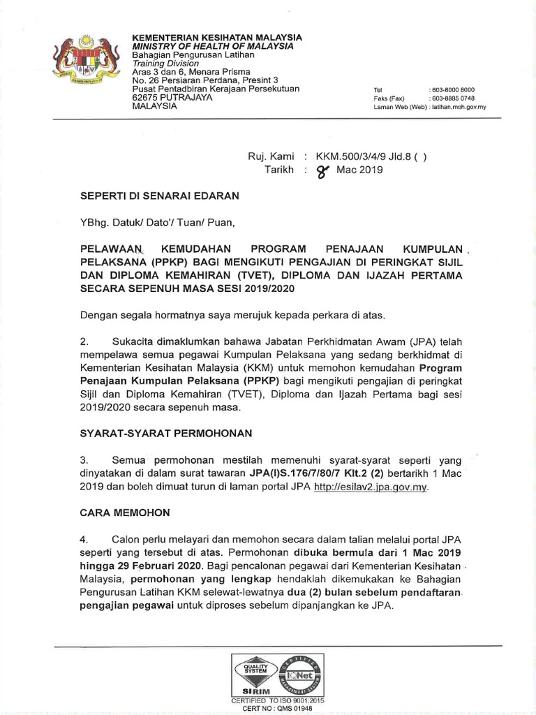 Tawaran permohonan penajaan/ cuti belajar ini dibuka mulai 15 januari sehingga 31 januari 2020 secara dalam talian (online) melalui sistem nota :
