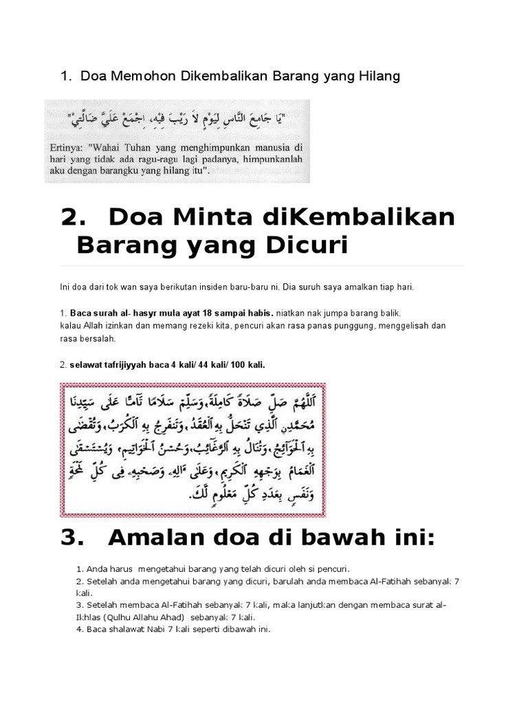 Amalan saat barang berharga hilang. Sesungguhnya engkau maha kuasa atas segala sesuatu. nah, demikianlah 5 amalan doa mencari barang hilang karena dicuri, lupa. Semua video saya telah di download dan telah di upload dalam channel. Berikut adalah doa yang dapat kamu baca. Adakah amalan untuk mengembalikan barang hilang? Ada doa yang bisa kamu baca agar barang yang hilang bisa kembali. Macam baru tadi ada dekat tangan, tak tahu kenapa susah nak ingat letak kat mana. Doa ditemukan barang yang hilang….berdoa adalah ibadah…. Atau anda juga boleh merujuk doa barang yang hilang dalam rumi seperti dalam gambar di bawah ini: Amalan doa agar barang yang hilang segera ditemukan. Ada orang yang kehilangan barang berharga, sepeda motor. Sesiapa memenuhinya, maka dia akan mendapat segala yang diminta dan sesiapa yang mengabaikannya, dialah orang yang melampaui batas dalam berdoa sehingga tidak. Atau doa khusus untuk mengembalikan barang hilang?