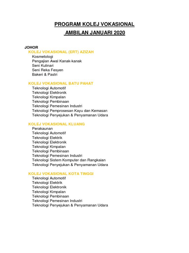 Berikut dikongsikan adalah maklumat tentang senarai kolej vokasional dan kursus yang ditawarkan di seluruh kolej vokasional batu lanchang.