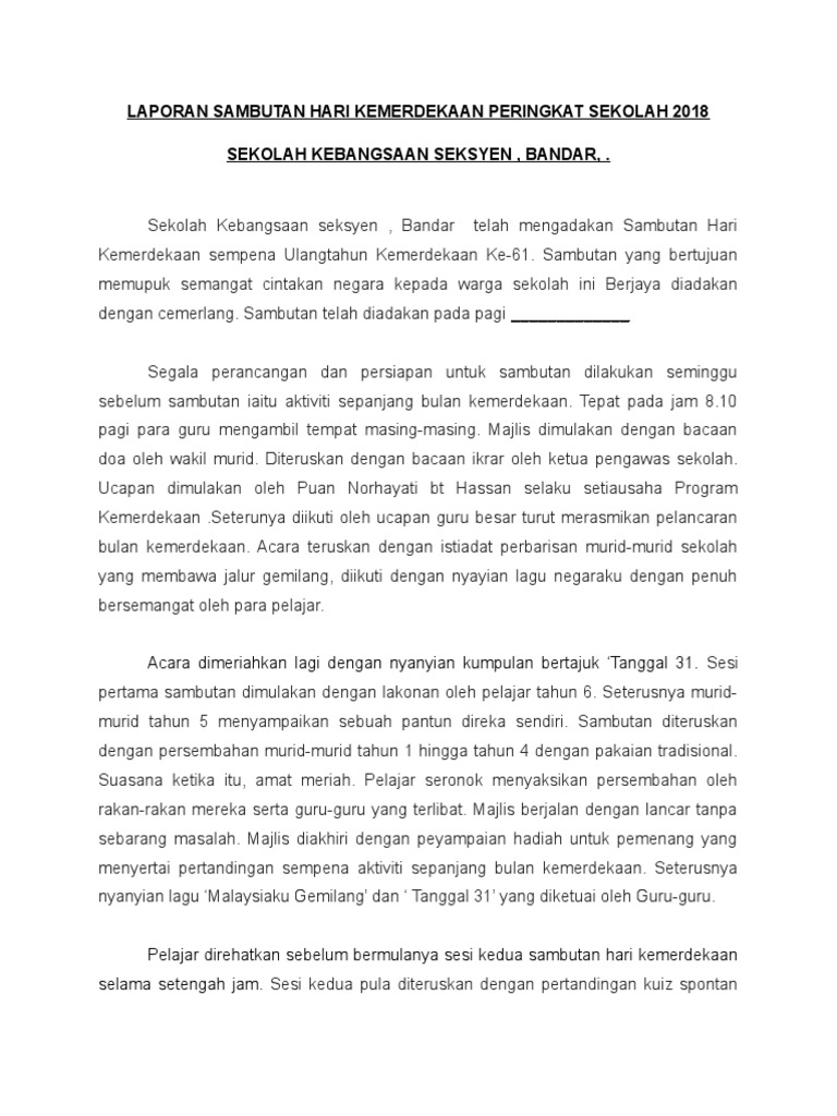 Laporan Sambutan Hari Kemerdekaan from imgv2-1-f.scribdassets.com Sambutan hari kemerdekaan ke 61 peringkat sekolah sekolah kebangsaan sungai dua for more information and source, see on this link : Sambutan ini diadakan adalah untuk meraikan ulang tahun kemerdekaan malaysia yang ke 55 pada tahun ini. Kemudian, nyanyian lagu patriotik yang dipimpin oleh kumpulan koir sekolah.seterusnya ceramah kemerdekaan oleh tuan haji adnan bin muda. Pada 3 september 2012 , sekolah kebangsaan seri perling 2 telah mengadakan sambutan kemerdekaan peringkat sekolah di dewan seri perling. Majlis dimulakan pada pukul 8 00 pagi dengan bacaan doa. >>kertas kerja sambutan bulan kemerdekaan 2020<< sumber download: Apabila tirai pentas dibuka kumpulan koir bulan kemerdekaan sekolah menengah satria perdana sungkai telah bersedia untuk. Contoh karangan laporan sambutan kemerdekaan peringkat sekolah.