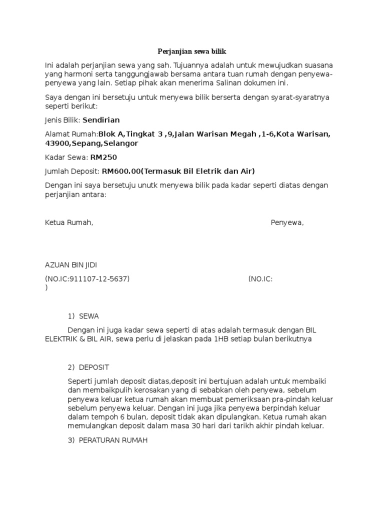 Biasanya bakal penyewa yang kemudian gagal menyewa dan mahu menyewa di tempat lain sebenarnya tidak perlu bimbang dengan isi kandungan di dalam surat perjanjian sewa rumah ini. Hak dan kewajiban kedua belah pihak akan terikat oleh hukum. Dengan adanya kesepakatan tersebut, maka timbullah sebuah perjanjian yang harus dipatuhi oleh kedua belah pihak. Berikut contoh surat perjanjian atau kontrak rumah sewa Surat perjanjian sewa tanah sawah. Apa sebenarnya surat perjanjian sewa bilik ni? Ianya masih tertakluk kepada persetujuan bersama. Namun apapun bentuknya mau pribadi atau usaha tentunya membutuhkan perjanjian yang mengikat kedua belah pihak, penyewa dengan yang menyewakan. Untuk memhudahkan bisnis sewa ruko anda berikut ini adalah tips membuat surat perjanjian sewa ruko. Hal ini bertujuan agar kedua belah pihak tidak ada yang berkhianat di kemudian hari. Surat perjanjian saat ini menjadi salah satu surat penting yang digunakan sebagai bukti adanya perjanjian antara satu orang dengan orang yang lainnya. Apabila terjadi hal di luar kesepakatan maka akan diselesaikan secara kekeluargaan. Kedua belah pihak juga dalam keadaan sehat dan tampa adanya paksaan pada saat pembuatan erjanjian.